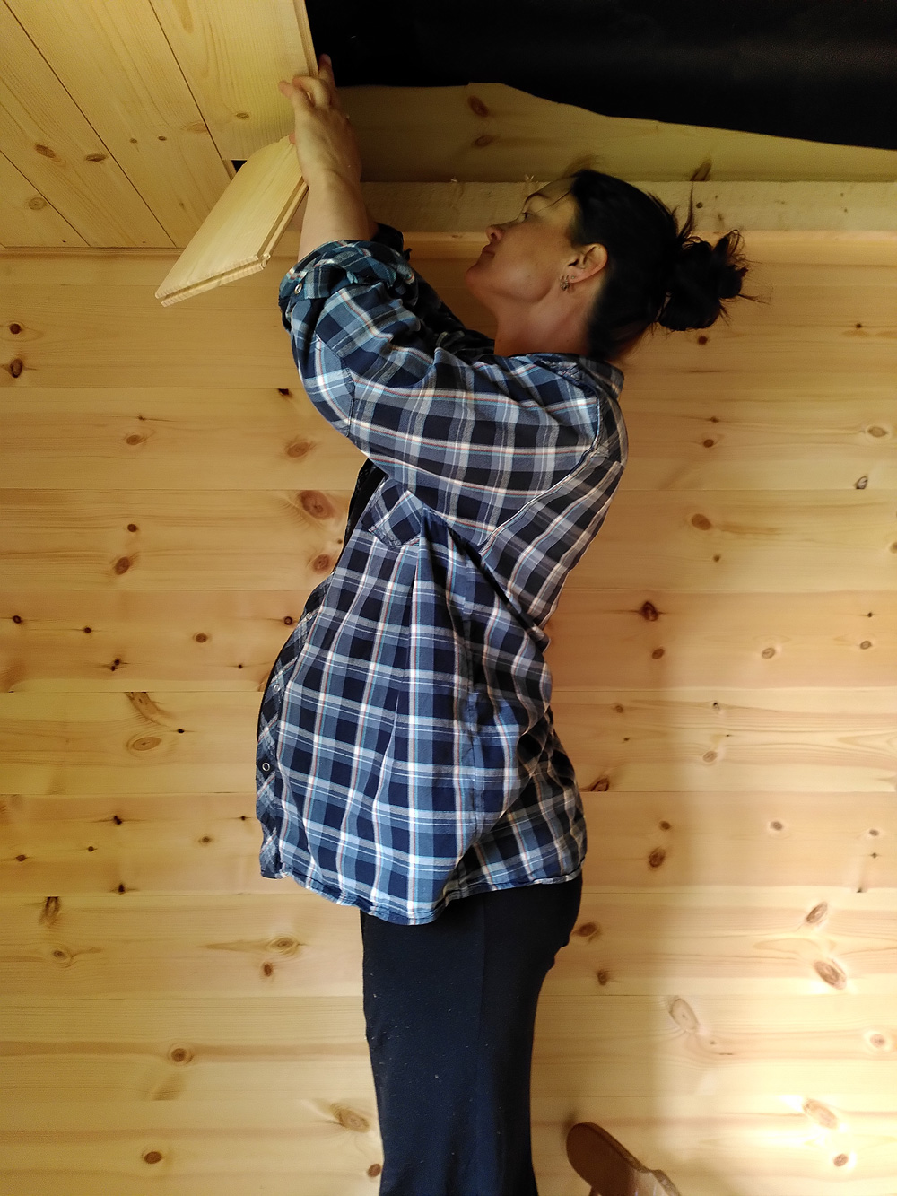 - Att sätta panel i stugan är ett fantastiskt gravidjobb, för det är så svalt vid timmerstommen! Och den här panelen är så fin.
