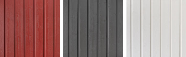 Ytterpanelen på väggblocken är grundmålad och mellanstruken. Det sparar tid och ger en högre kvalitet på den målade ytan. Den slutliga strykningen gör du själv inom två år efter montering av huset. Du kan välja mellan faluröd, mörkgrå, husvit eller obehandlat.